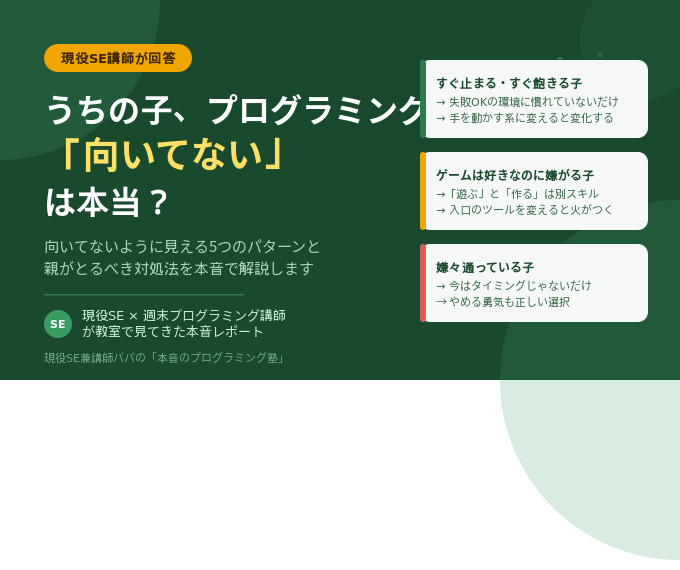 「うちの子、プログラミング向いてないのかも…」 そう感じている保護者の方、実は少なくないんです。 授業中に固まってしまう、すぐに飽きてしまう、全然楽しそうじゃない…。そんな姿を見ていると、「うちの子には合ってないのかな」と心配になりますよね... -